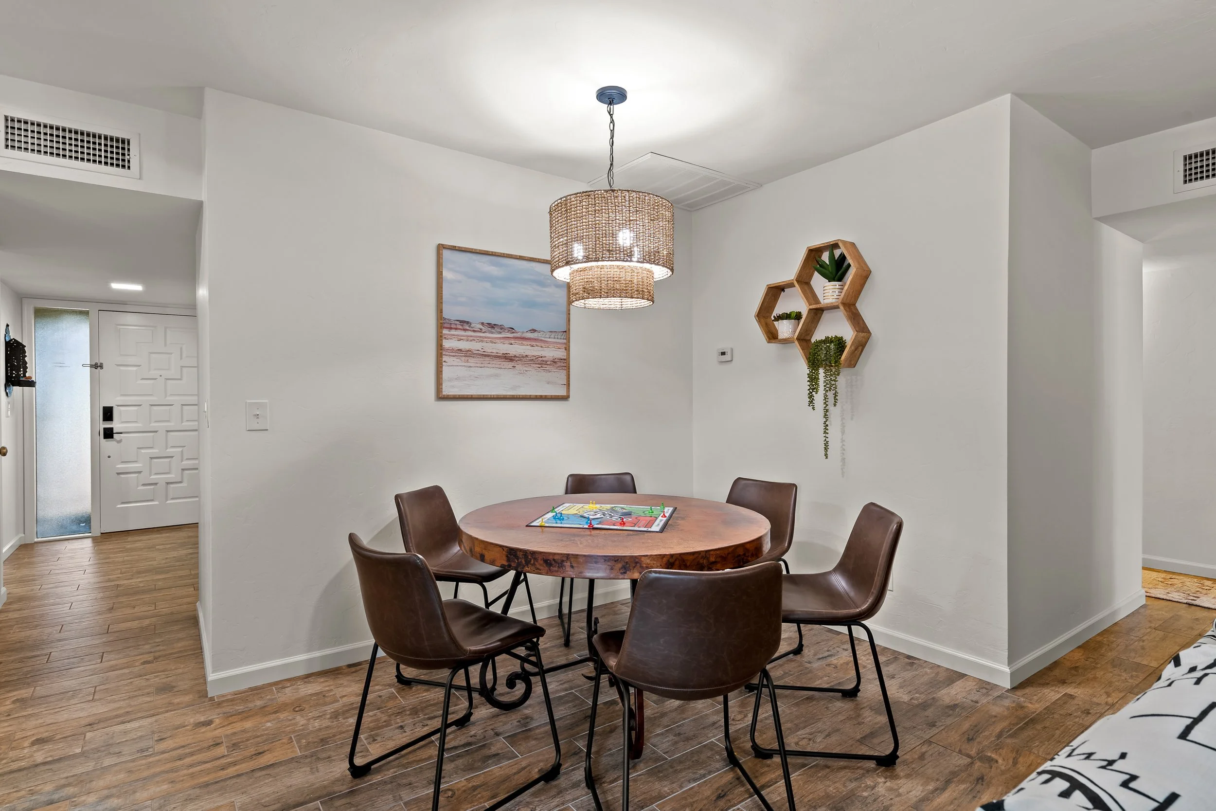 Experience desert elegance at this vibrant, one-acre retreat designed for relaxation and celebration. This mid-century gem offers over 2500 square feet of designed living space, with vibrant decor and a spacious backyard oasis. Perfect for family vacations or a getaway with friends.