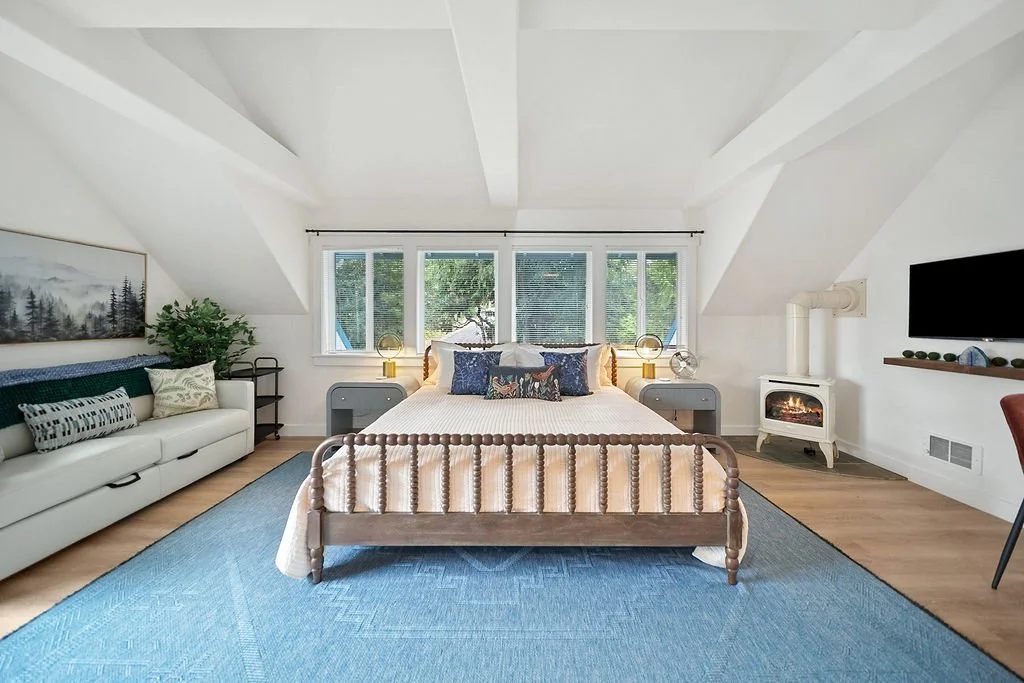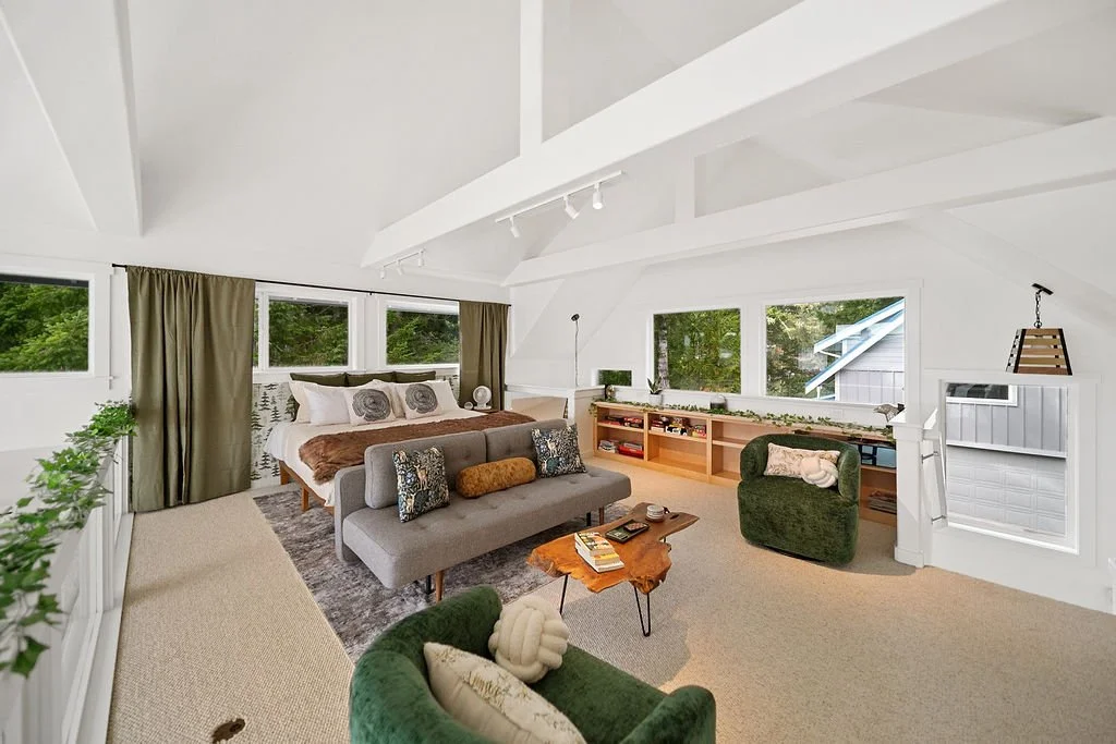 Stay in the main house with incredible hood canal views and cove access. Sleep comfortably in the luxurious king sized primary suite with an ensuite bathroom with jacuzzi, work space, and private deck. Additional king bed in loft with water views. Ideal for a relaxing getaway.
